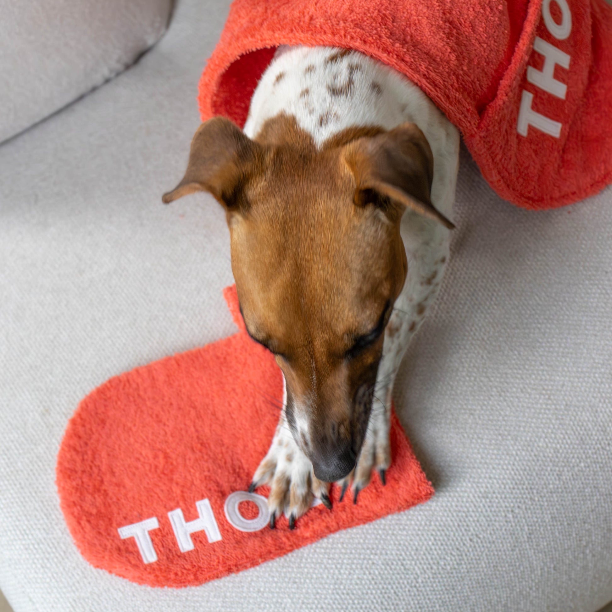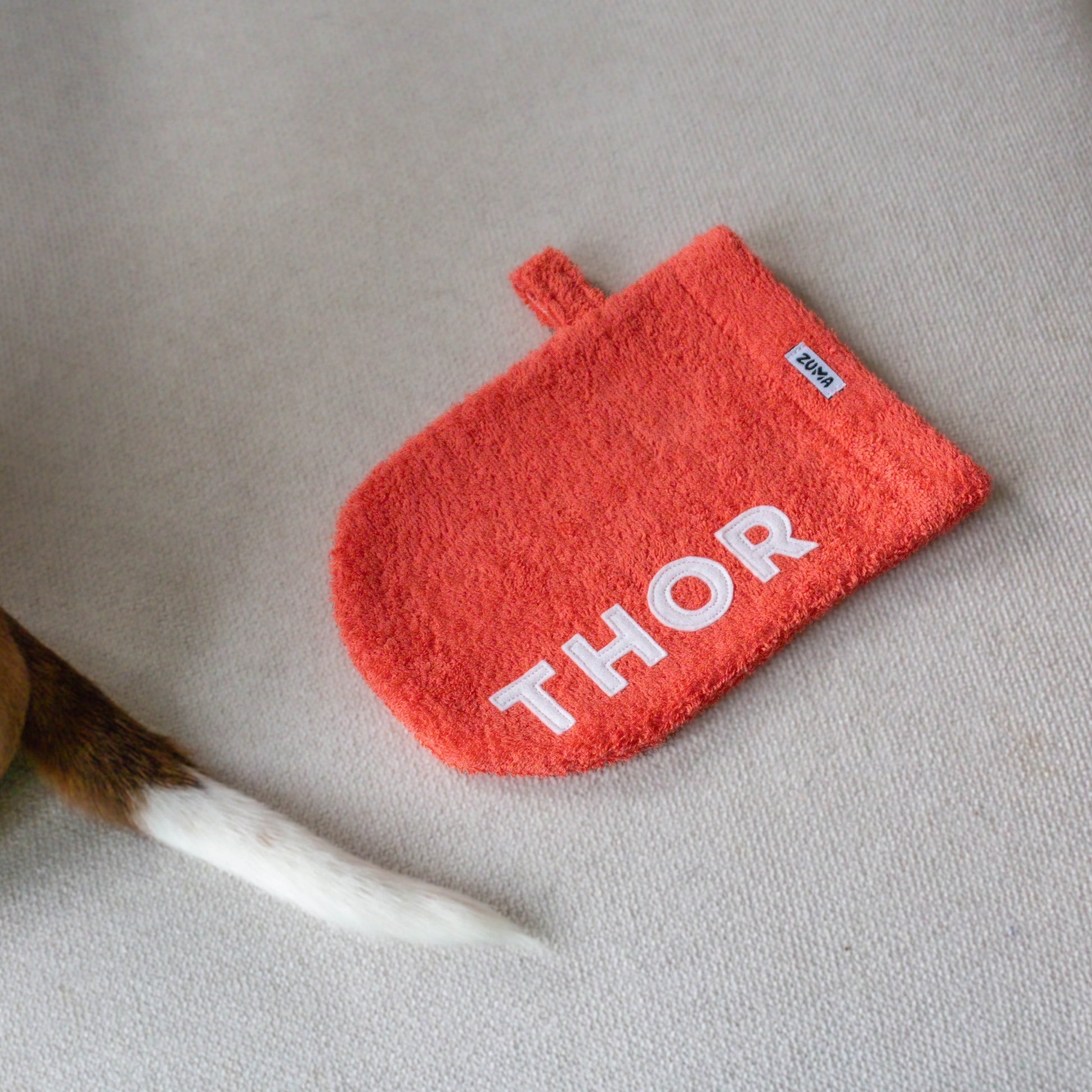 Kies de kleur van de washand en de kleur van de naam van je hondje en maak jouw washandje uniek. Omwille van plaats, mag de naam maximaal 6 letters bevatten. Heeft je hond een langere naam? Stuur ons een berichtje en we kijken wat mogelijk is.
