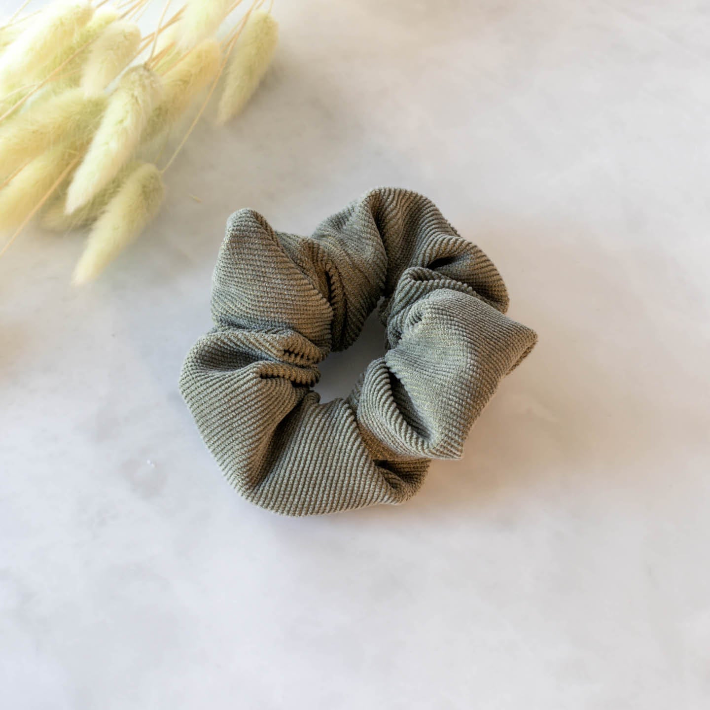 Matchen met jouw viervoeter? Kies voor een matching scrunchie van zachte corduroy in een trendy kaki kleur met smalle rib.