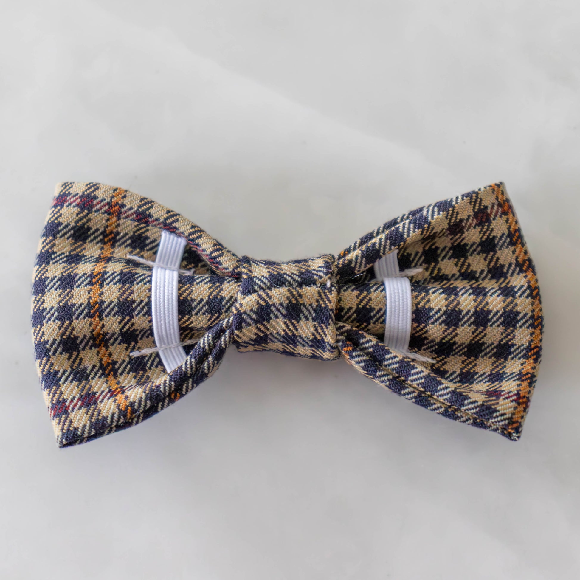 De vlinderdas heeft achteraan elastiekjes, zodat deze eenvoudig aan een halsband kan worden bevestigd.