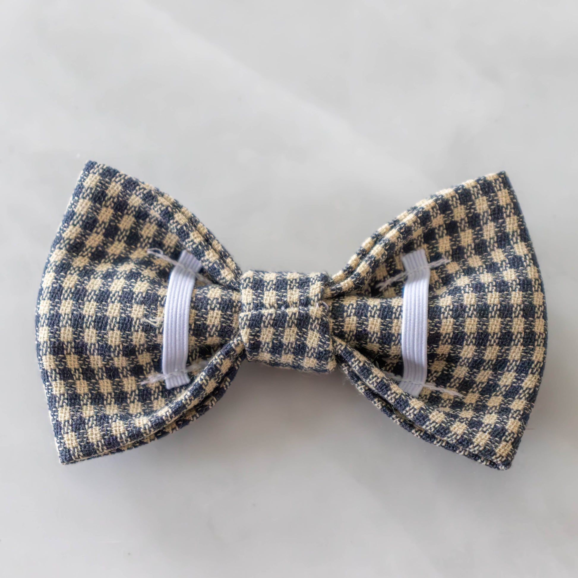 De vlinderdas heeft achteraan elastiekjes, zodat deze eenvoudig aan een halsband kan worden bevestigd.